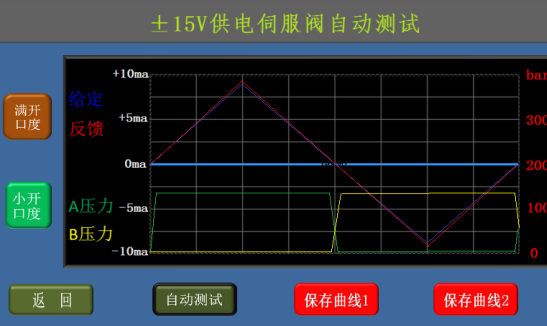 6、伺服閥正常時的表現(xiàn)為:a、給定電流0ma時,反饋電流在0ma,伺服閥輸出的A、B腔壓力相同;b、用滑動條可迅速換向,反饋電流改變且A、B腔壓力差較大;c、點擊增加按鈕,反饋電流逐漸增加且A、B腔壓力差逐漸增大;d、點擊減少按鈕,反饋電流逐漸減少且A、B腔壓力差逐漸減少,過0ma后伺服閥會換向;