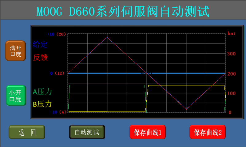 8、選擇滿開口度后點(diǎn)擊“自動(dòng)測試”可使伺服閥從0開口度逐漸增加到+100%開口度,再逐漸減少到-100%,然后逐漸增加到0開口度;選擇小開口度后點(diǎn)擊“自動(dòng)測試”可使伺服閥從0開口度逐漸增加到+20%開口度,再逐漸減少到-20%,然后逐漸增加到0開口度;