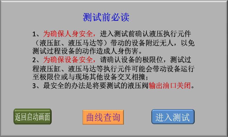 3、確認(rèn)現(xiàn)場人員和設(shè)備安全后,點(diǎn)擊“進(jìn)入測試”,進(jìn)入液壓閥測試類型選擇畫面;